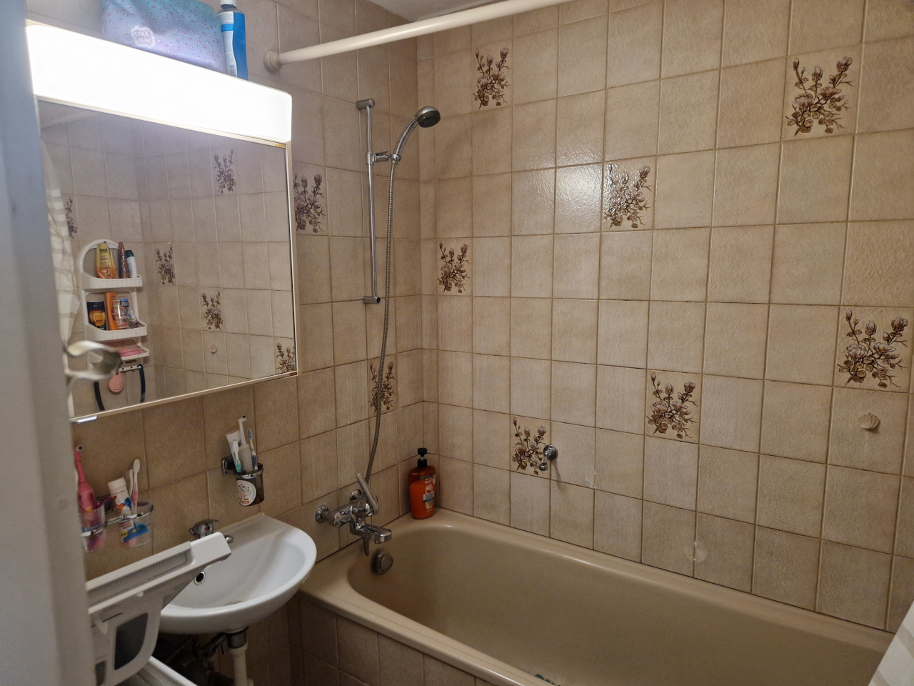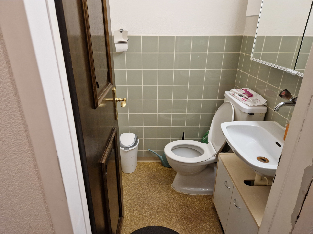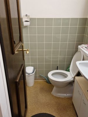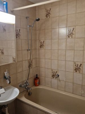 Der Nasszellenbereich gliedert sich in zwei Räume. In einem Raum ist das WC mit dem Lavabo angebracht. Im zweiten Raum befindet sich die Badewanne mit dem Lavabo.