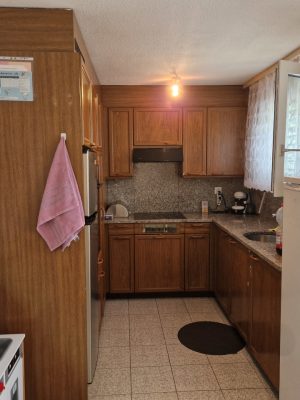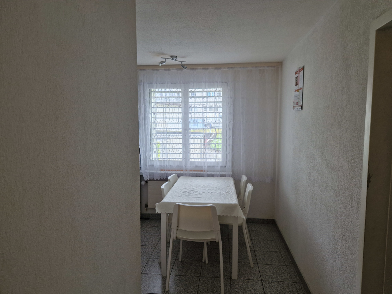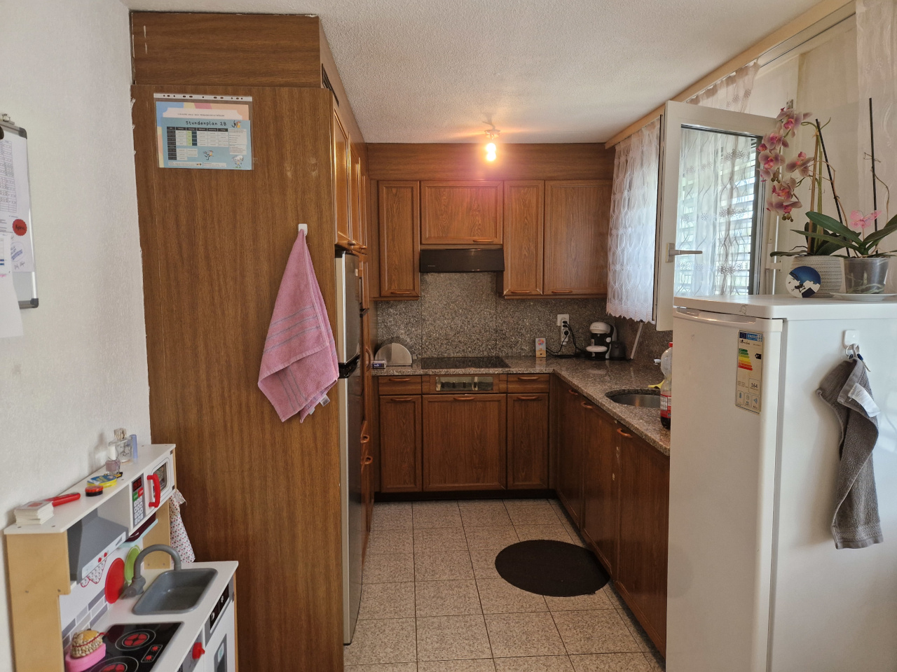 Gang, Küche, Essbereich und die Nasszellen sind mit Keramikplatten belegt.